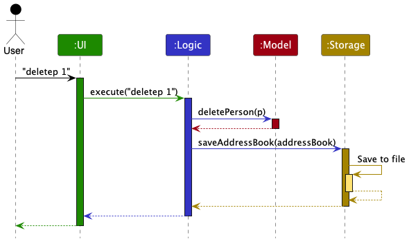 The Sequence Diagram below shows how the components interact with each other for the scenario where the user issues the command deletep 1.