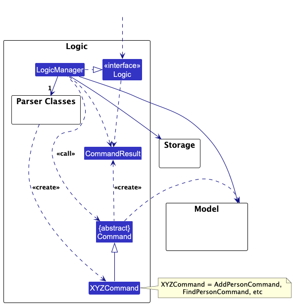Logicis called upon to execute a command, it is passed to anAddressBookParserobject which in turn creates a parser that matches the command (e.g.,DeletePersonCommandParser) and uses it to parse the command. - This results in a